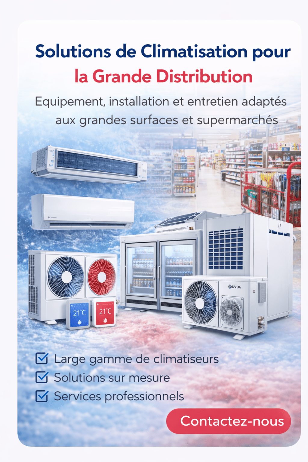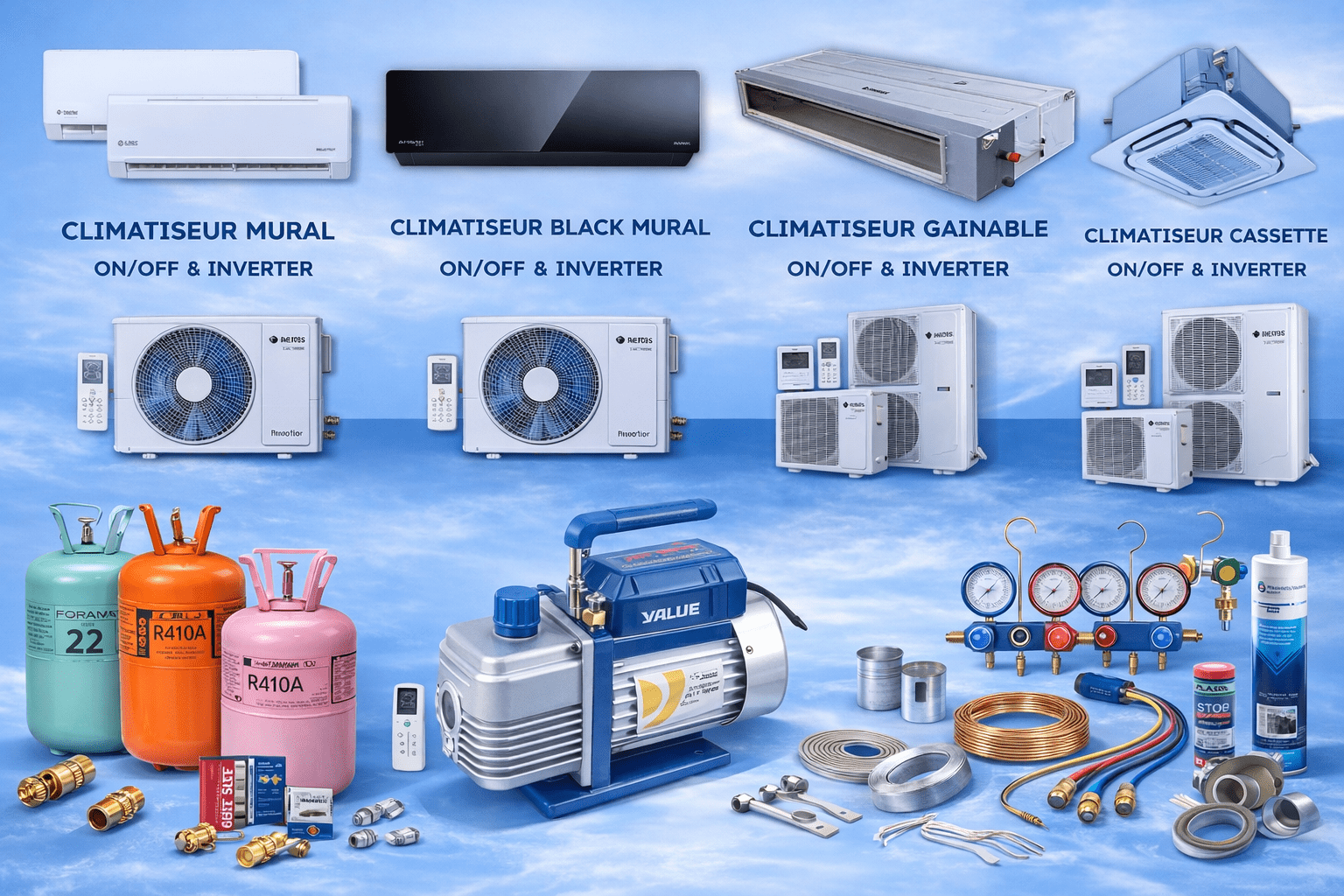 Chez New Prog, nous mettons à disposition une large gamme de produits et de matériels : systèmes muraux, gainables, cassettes, solutions industrielles, accessoires de ventilation, grilles, diffuseurs, conduits et consommables techniques. Notre objectif est simple : garantir un confort optimal, une efficacité énergétique élevée et une installation durable, même dans les environnements les plus exigeants.